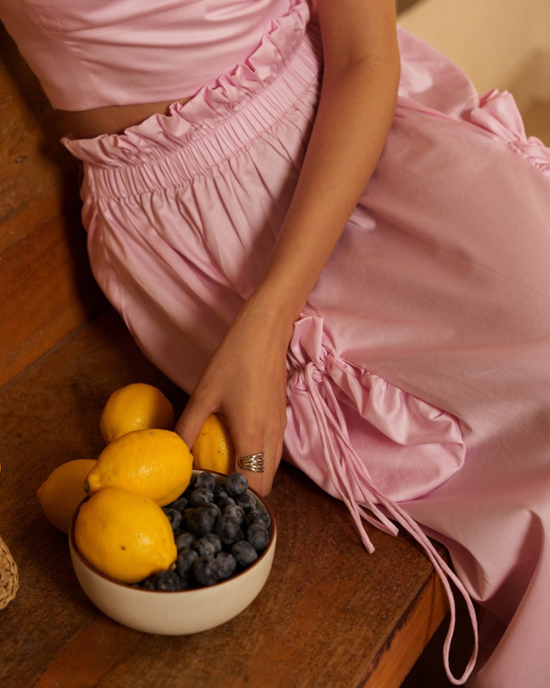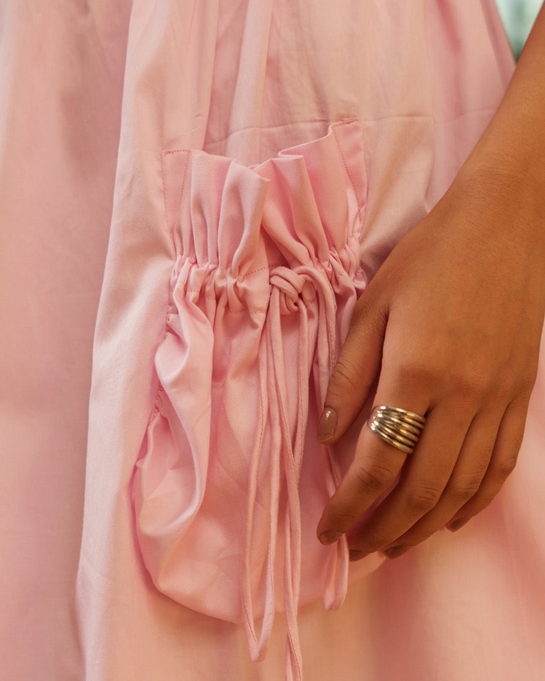 A charming pink co-ord set featuring a square-neck top with tie-up shoulder straps and an elastic smocked back for a perfect fit. The flared skirt comes with a fully elasticated waist, a delicate frill detail, and two front pockets accented with hanging drawstrings—adding a playful, functional touch to this twirl-worthy look.