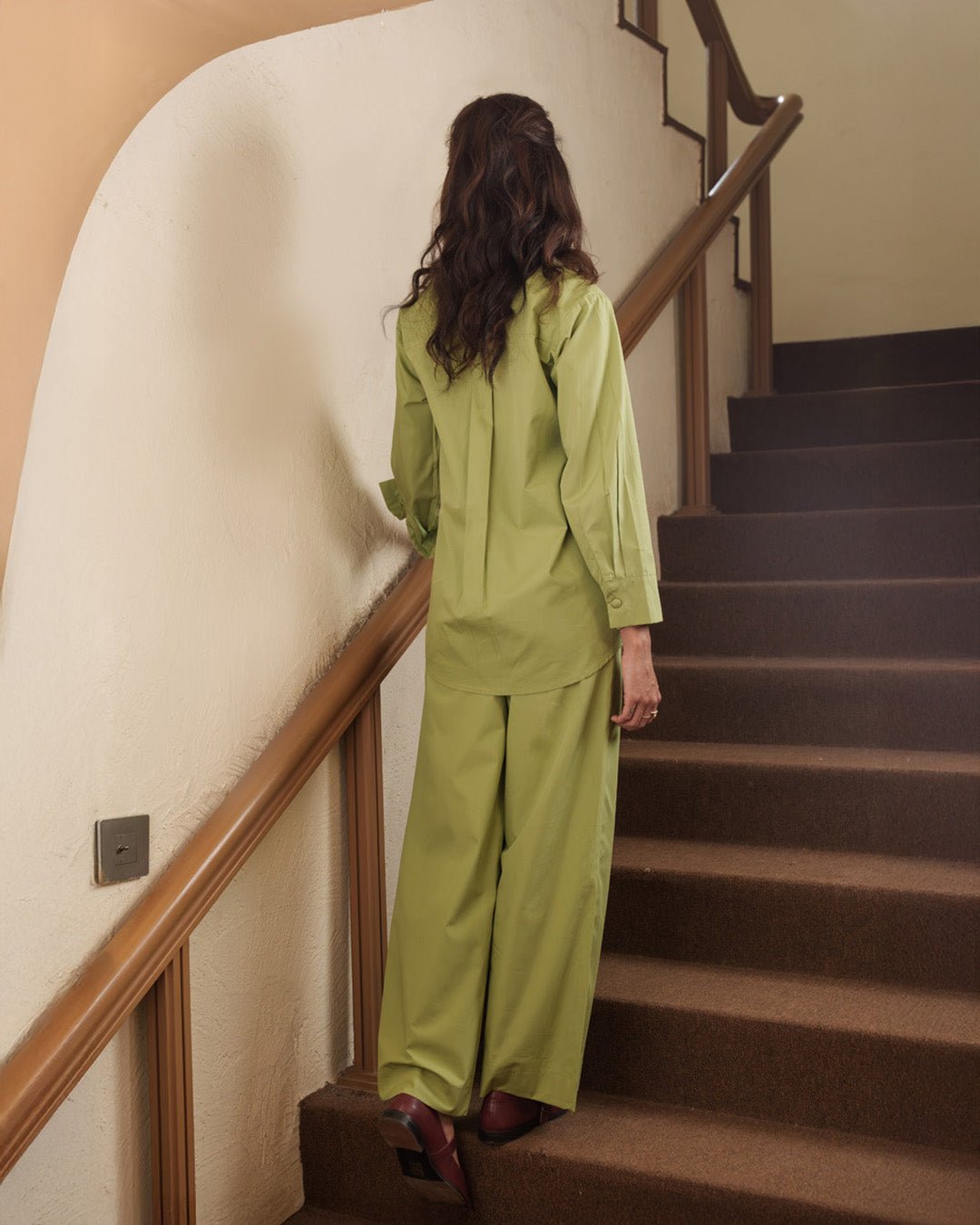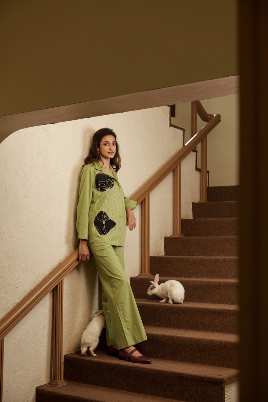 This green cotton co-ord set exudes effortless sophistication. The oversized shirt is thoughtfully detailed with black patchwork, intricate thread embroidery, and delicate loose thread accents, reflecting artisanal craftsmanship. Paired with straight, wide-leg pants, the ensemble offers a refined yet relaxed silhouette—perfect for those who appreciate understated luxury.