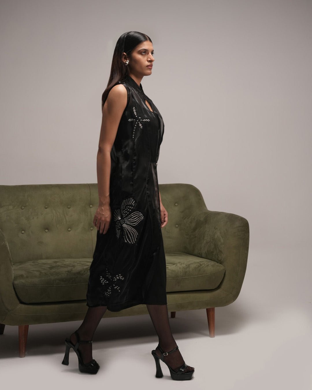 A luxurious long slip dress crafted from Russian silk, featuring a slightly A-line flared silhouette and a flattering V-neck. Layered with a detachable organza satin cap-style jacket, secured at the front with a delicate silver button loop, the overlay is adorned with intricate 3D floral and bird embroidery, blending ethereal elegance with artisanal craftsmanship for a statement look.