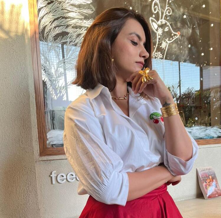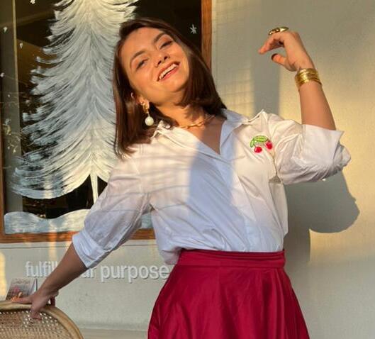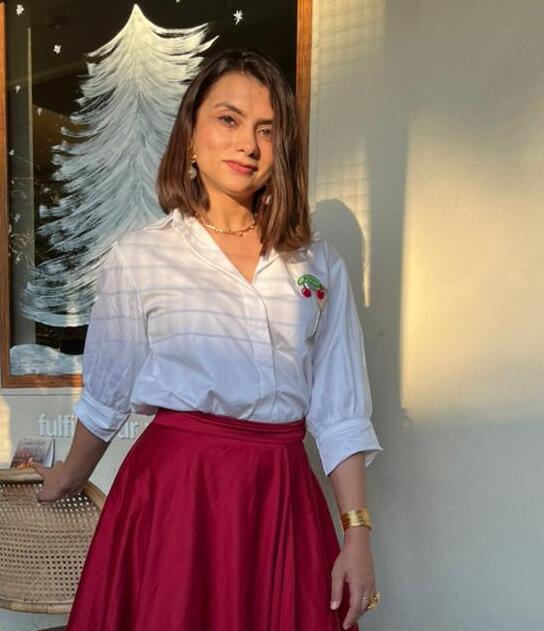 The Shirt has an oversized white cotton shirt, designed with softly gathered sleeves for a relaxed, sculptural silhouette. The look is elevated by a delicate red cherry wine-glass butta embroidery patch, adding a playful yet refined accent. It gives a subtle charm.